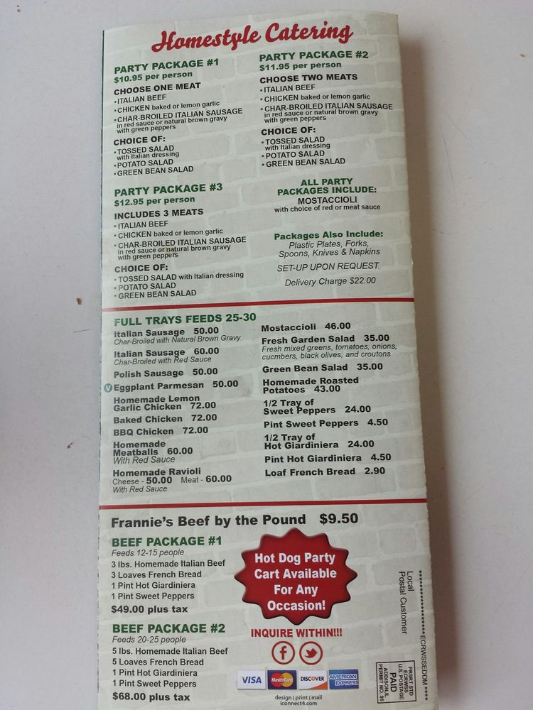 Introducing the menu at Frannie's Beef & Catering, a gem nestled in Schiller Park, IL, where the essence of American fast food tantalizes the palate. Renowned for their Italian beef sandwiches, diners rave about the depth of flavor, especially when paired with homemade peppers. The menu boasts an array of grilled specialties like the Philly Steak Sandwich and hearty pork chop sandwiches, ensuring every visit is a new culinary adventure.